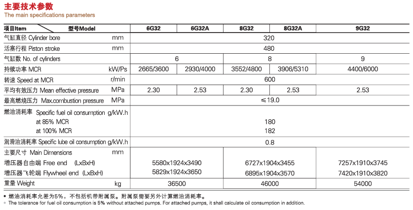 G32型船用柴油機(jī)為四沖程、水冷、直接噴射、廢氣渦輪增壓、中間空氣冷卻、不可逆轉(zhuǎn)的柴油機(jī)。有6缸、晌 、9缸 ,功率2665-4400kW等規(guī)格,可燃用運(yùn)動(dòng)粘度380厘海/50°C或雷氏1號(hào)