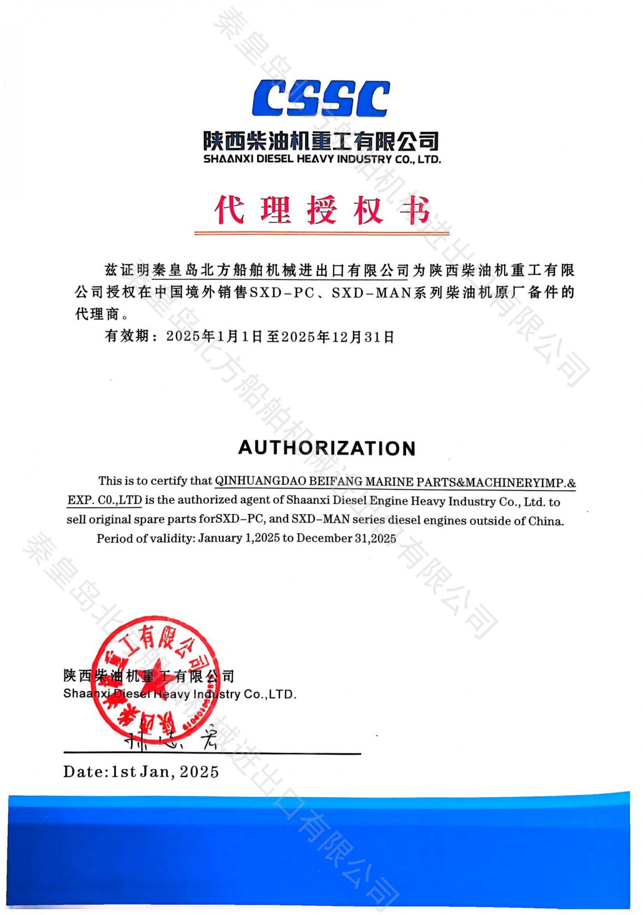 北方船舶與陜西柴油機重工有限公司簽訂備件代理授權(quán)書